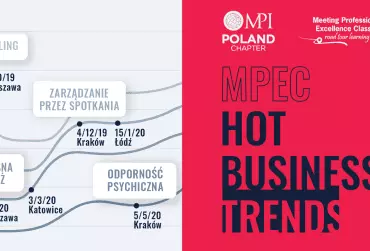 Już w październiku 2019 roku rusza nowa odsłona programu edukacyjnego Meeting Professional Exellence Classes organizowanego przez MPI Poland Chapter. Kolejna edycja cyklu warsztatów, tym razem realizowana pod hasłem „Hot Business Trends”, umożliwi dalszy rozwój, edukację i integrację branży MICE. Projekt MPEC 2019/2020 to 6 spotkań, 4 miasta i 4 tematy szkoleń, których nie można przegapić!